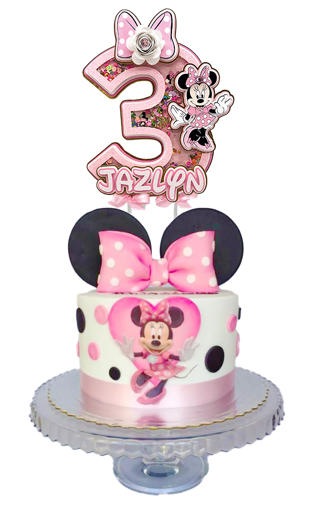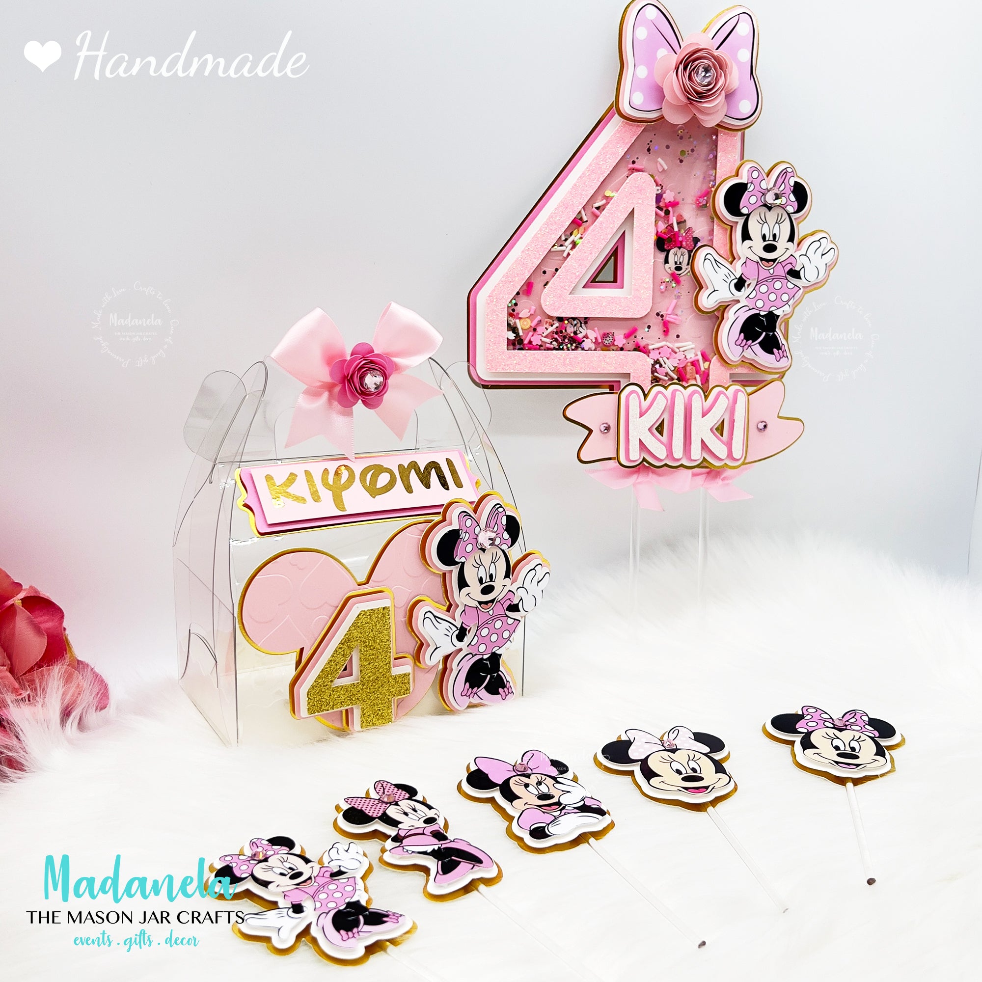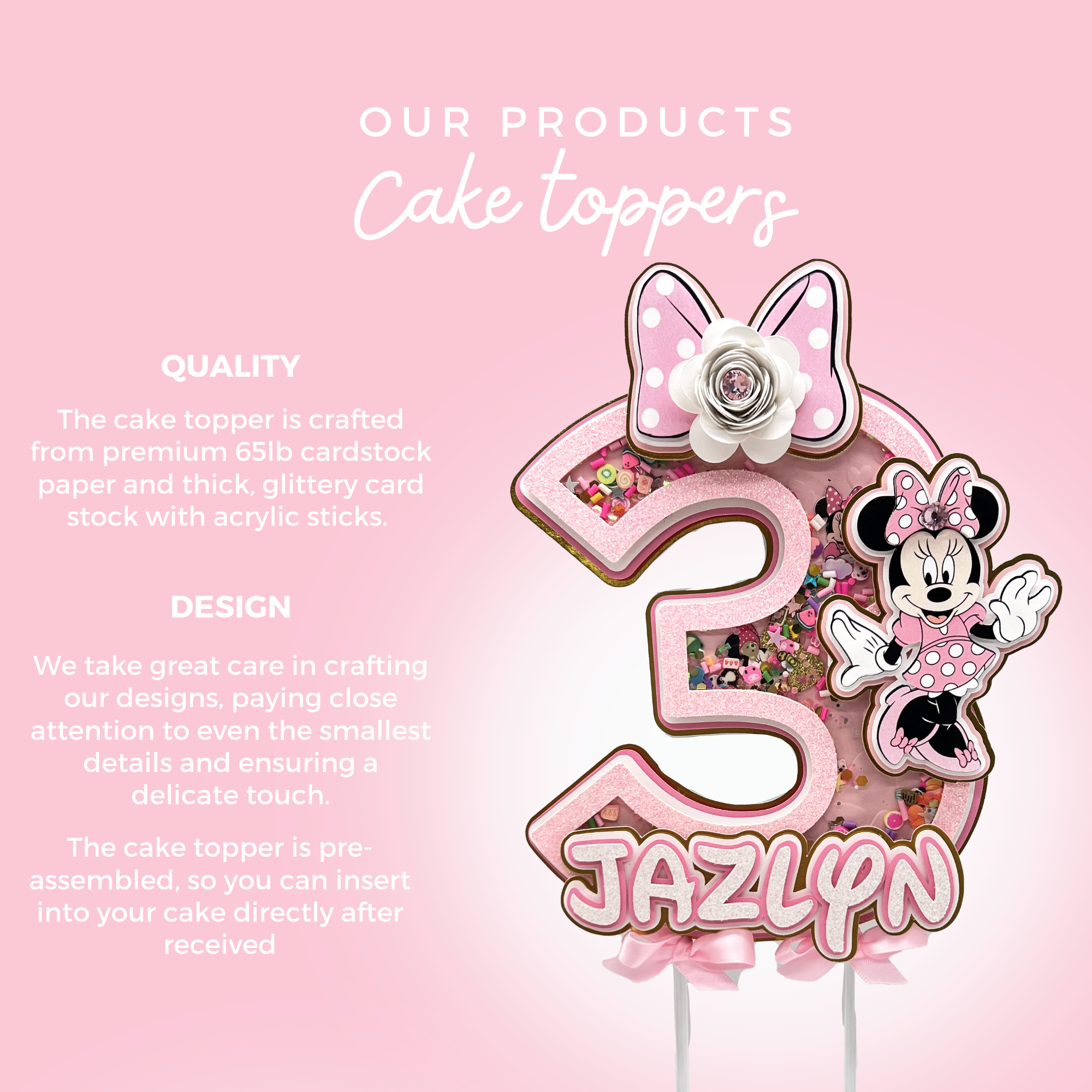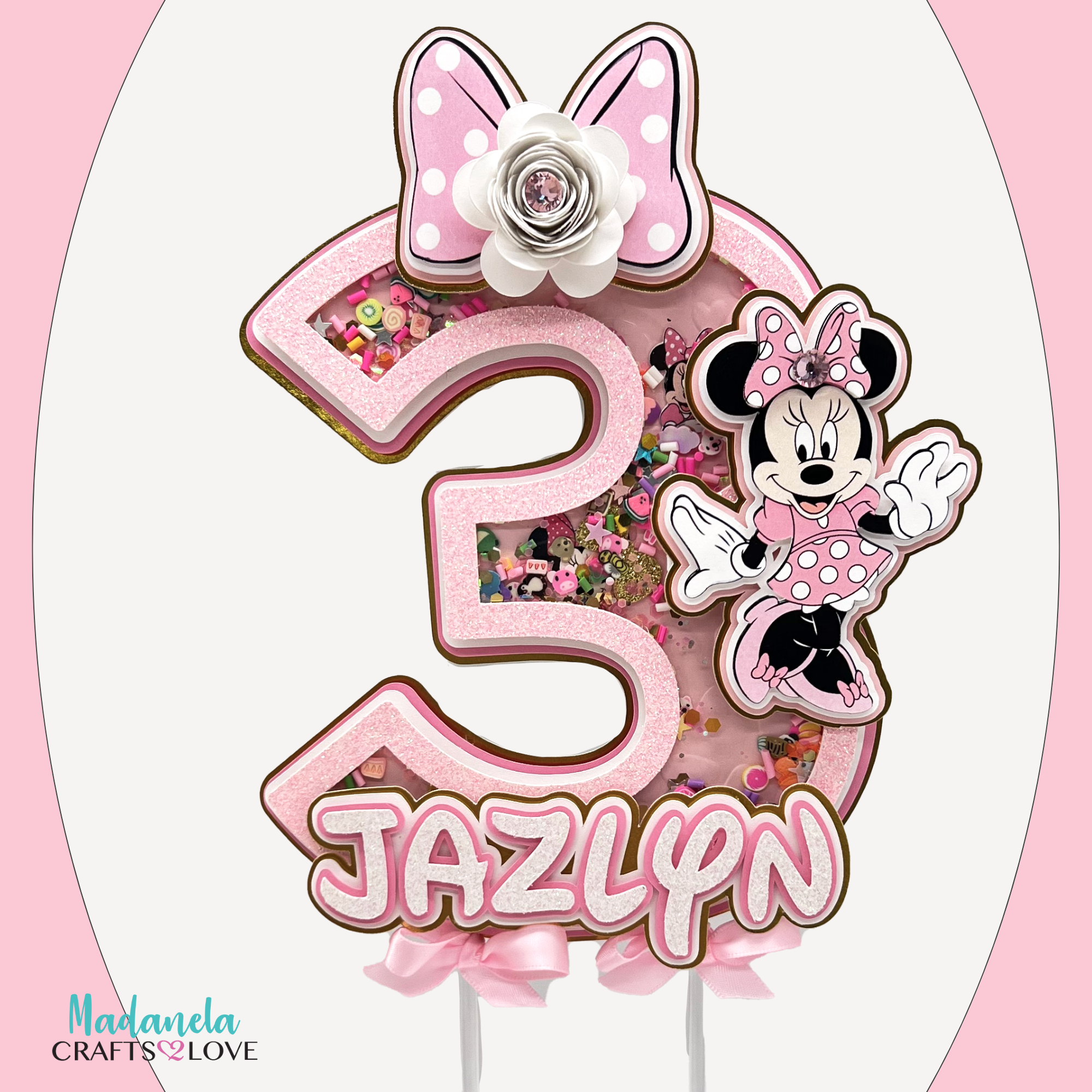 This handmade Minnie 3D shaker cake topper is a great way to add a sparkle to your child's cake. You can personalize this cake topper by adding the birthday girl's name. Find delicacy and quality on this fun cake toppers.